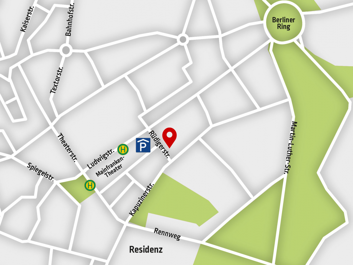 Unser Theater in der Rüdigerstraße 4 liegt unmittelbar hinter dem Mainfranken Theater. Am besten erreichen Sie uns mit öffentlichen Verkehrsmitteln oder zu Fuß. Die Haltestellen „Mainfranken Theater“ werden von den Buslinien 6, 12, 14, 16, 17, 20, 26, 28, 29, 114 und 214 bedient. Parkmöglichkeiten gibt es in den umliegenden Straßen sowie im Parkhaus am Theater schräg gegenüber.